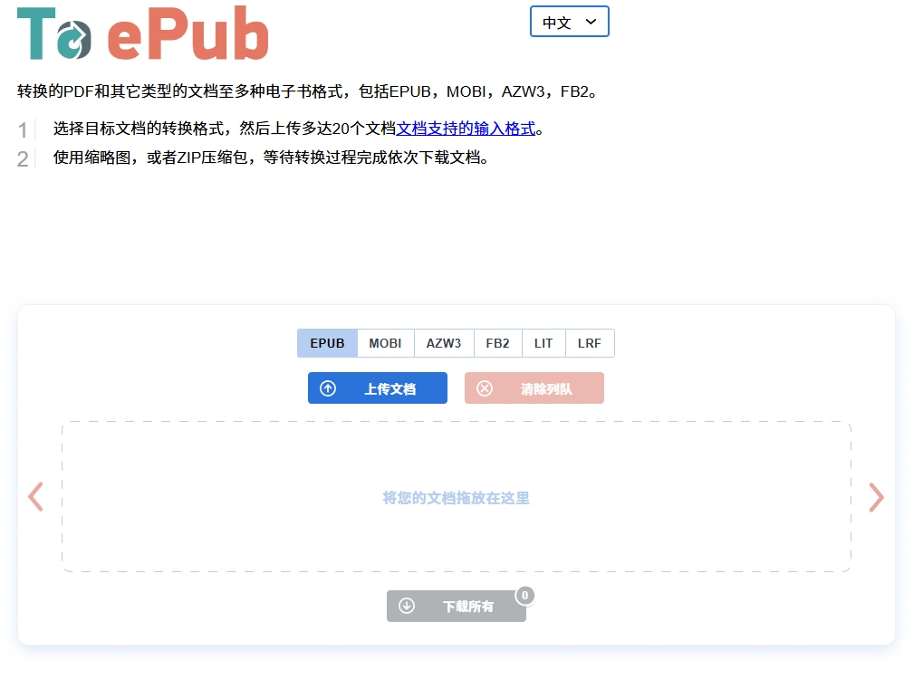 电子书格式转换工具,可将几十种文档格式转换为 EPUB、MOBI、AZW3、FB2、LIT、LRF 等六种格式,使书籍可在不同的阅读设备上进行查看,支持批量转换与下载,免费无水印,无需注册。
